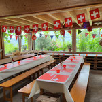 Wie jedes Jahr fand die Feier mit Familie und Freunden am Abend des 1. Augustes statt. Das schlechte (regnerische) Wetter konnte uns nicht trüb stimmen. Anstatt unter dem Nussbaum stellten wir die Tische in der Orangerie auf und genossen unser Nachtessen im "Schärmen". Der Himmel riss immer mehr auf und so konnten wir sogar das Feuerwerk draussen bestaunen. Und so verging wiederum ein wunderschöner Abend auf dem Mittler Gernet